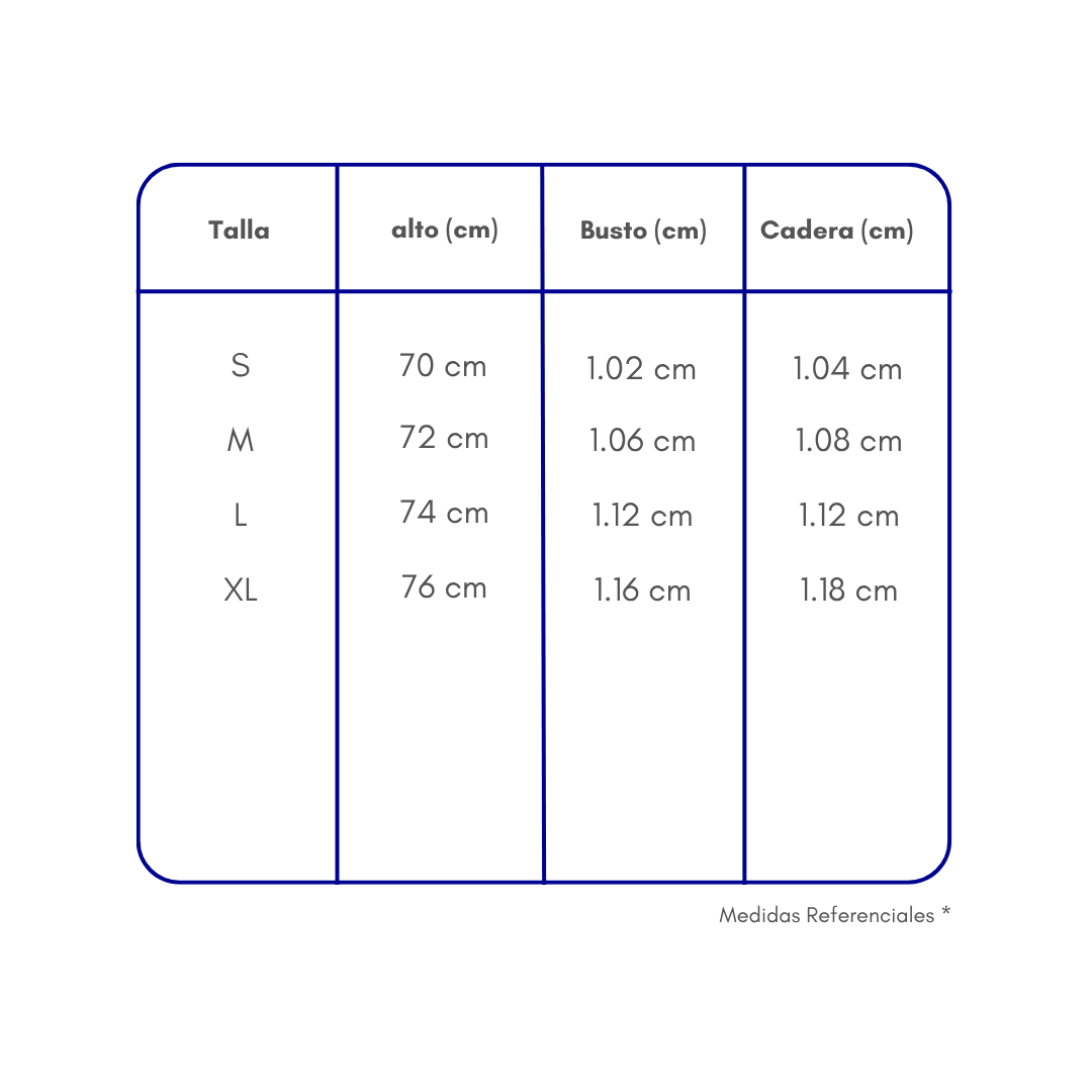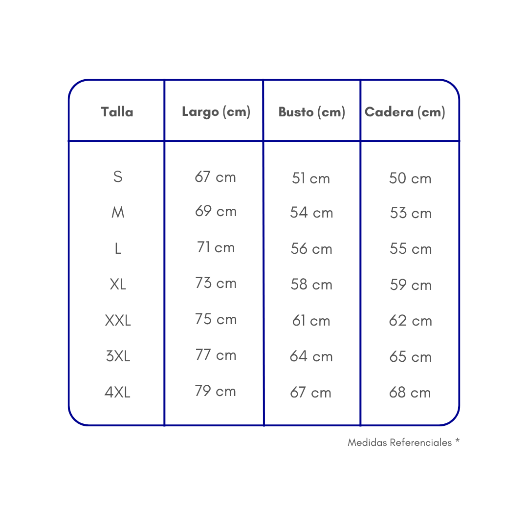 Las medidas que ves son referenciales y están tomadas en centímetros directamente sobre la prenda (no sobre el cuerpo).